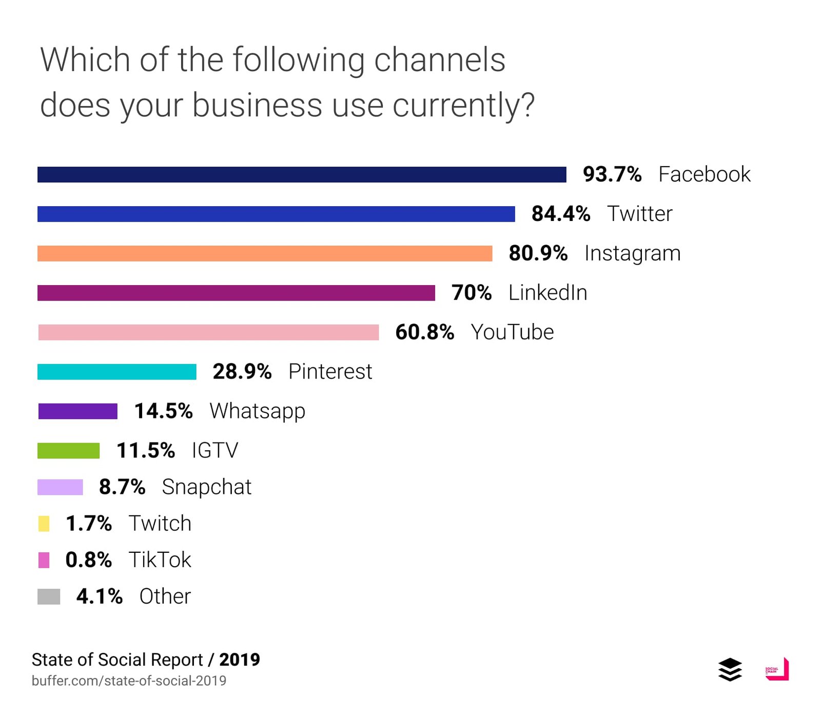 In a big State of Social Media 2019 Report, we found that 93.7 percent of businesses use and are currently active on Facebook — the most among any other social media network. 73% of Facebook users in the U.S. log into Facebook daily, compared with 59% on Instagram, 38% on Twitter, 27% on Pinterest, and 22% on LinkedIn, according to stats from Pew Research Center.