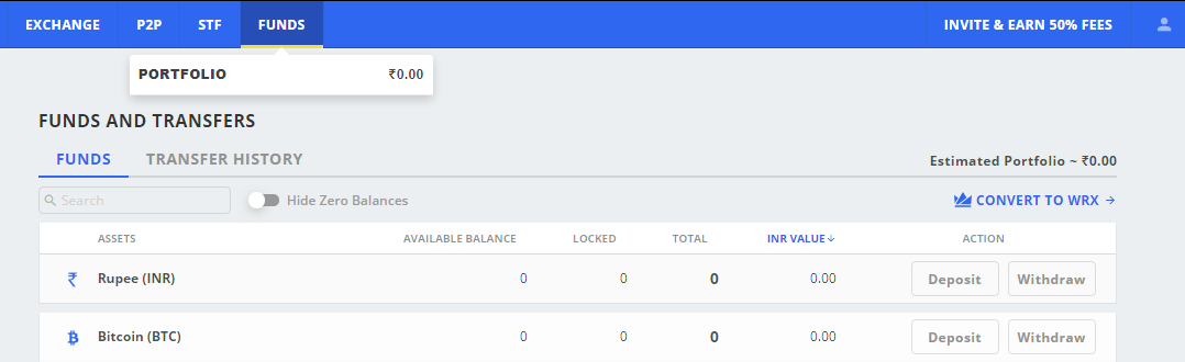 Now, once you have done all this basic setup the next thing you need to do is go to Funds. And here you will find an option for depositing Rupees (mentioned below). So here you click on deposit. (you have the option to deposit funds via UPI, IMPS, RTGs, NEFT. The standard deposit takes a few hours to one day. Whereas an instant deposit usually is done instantly)